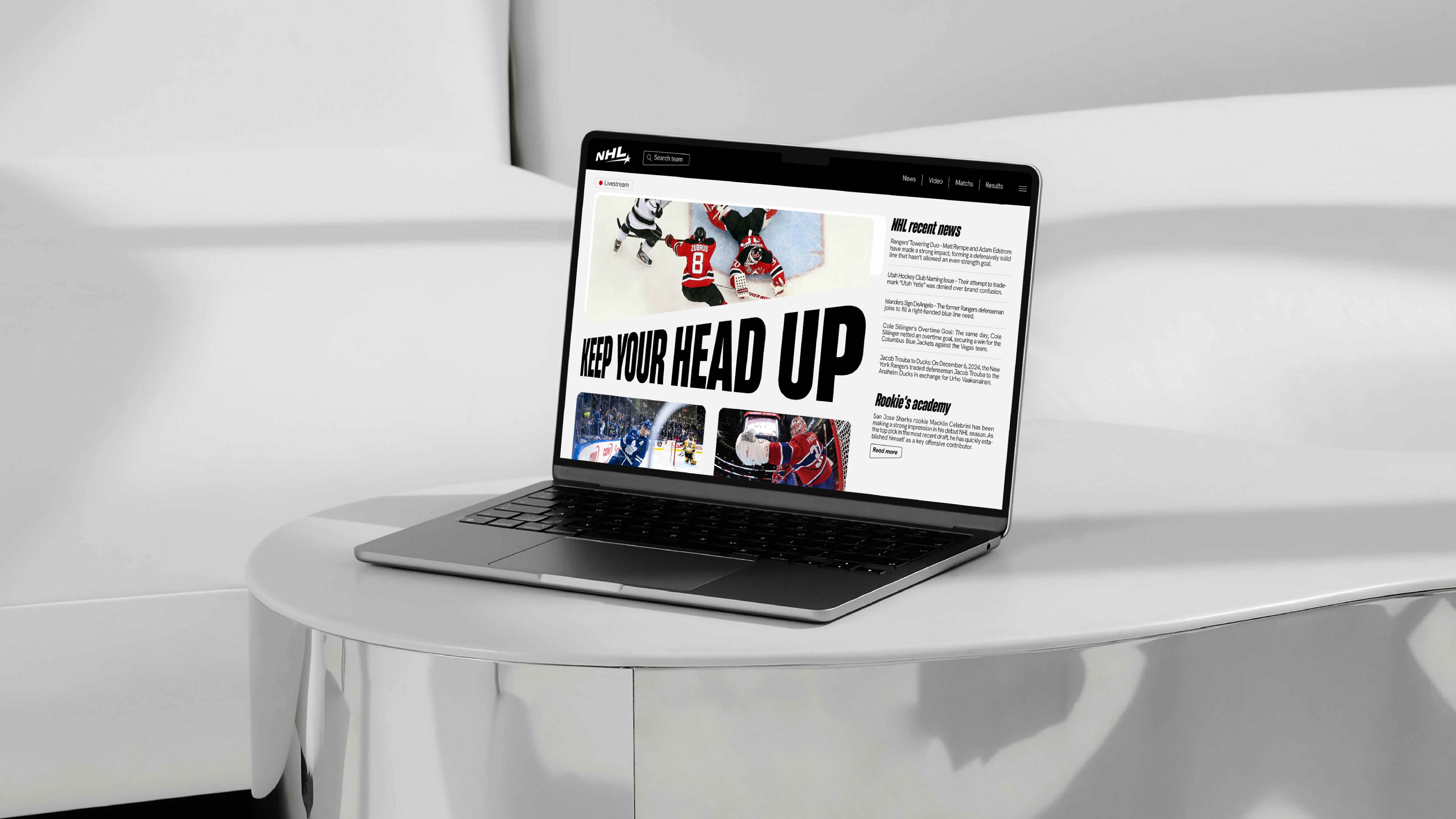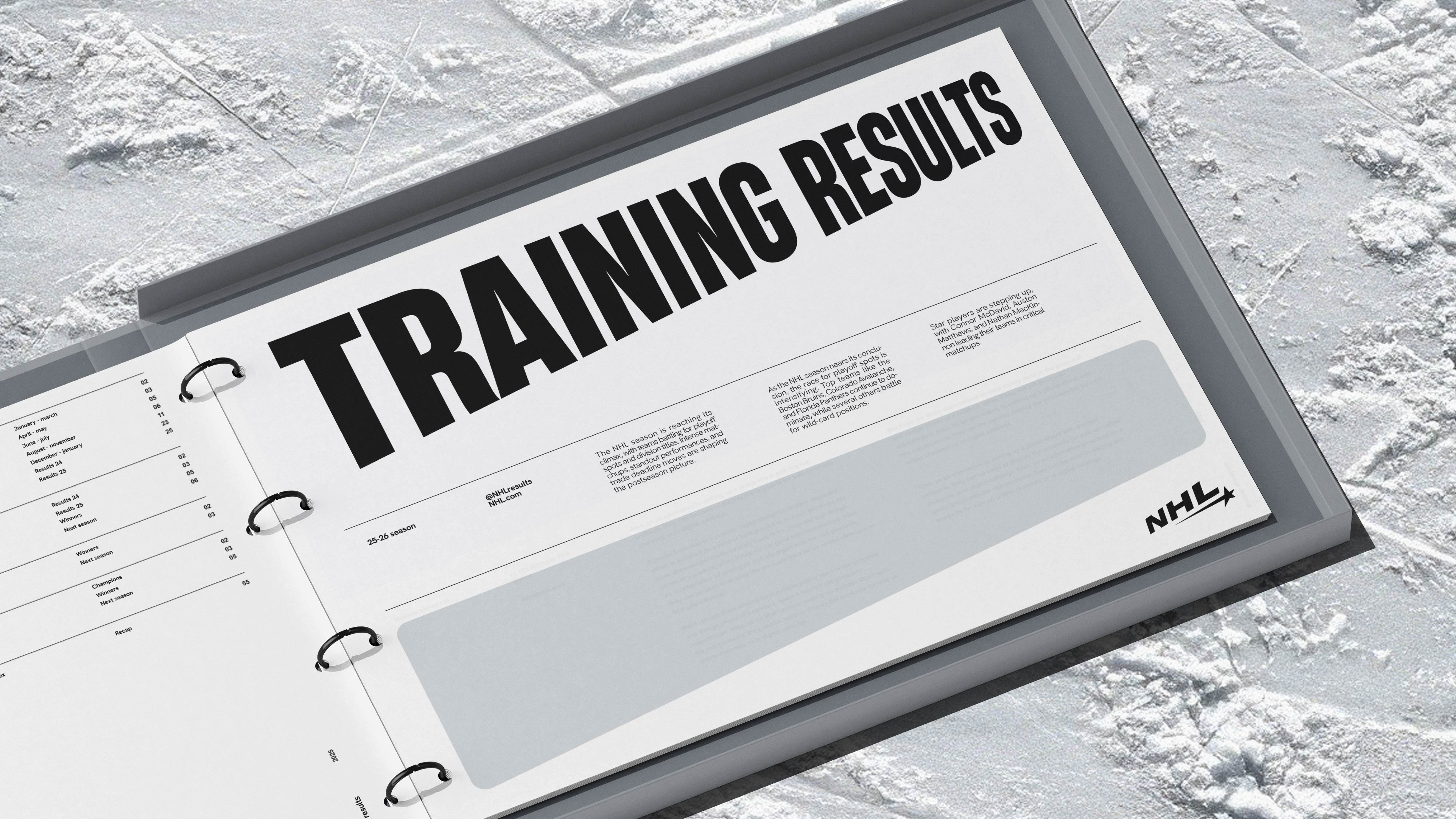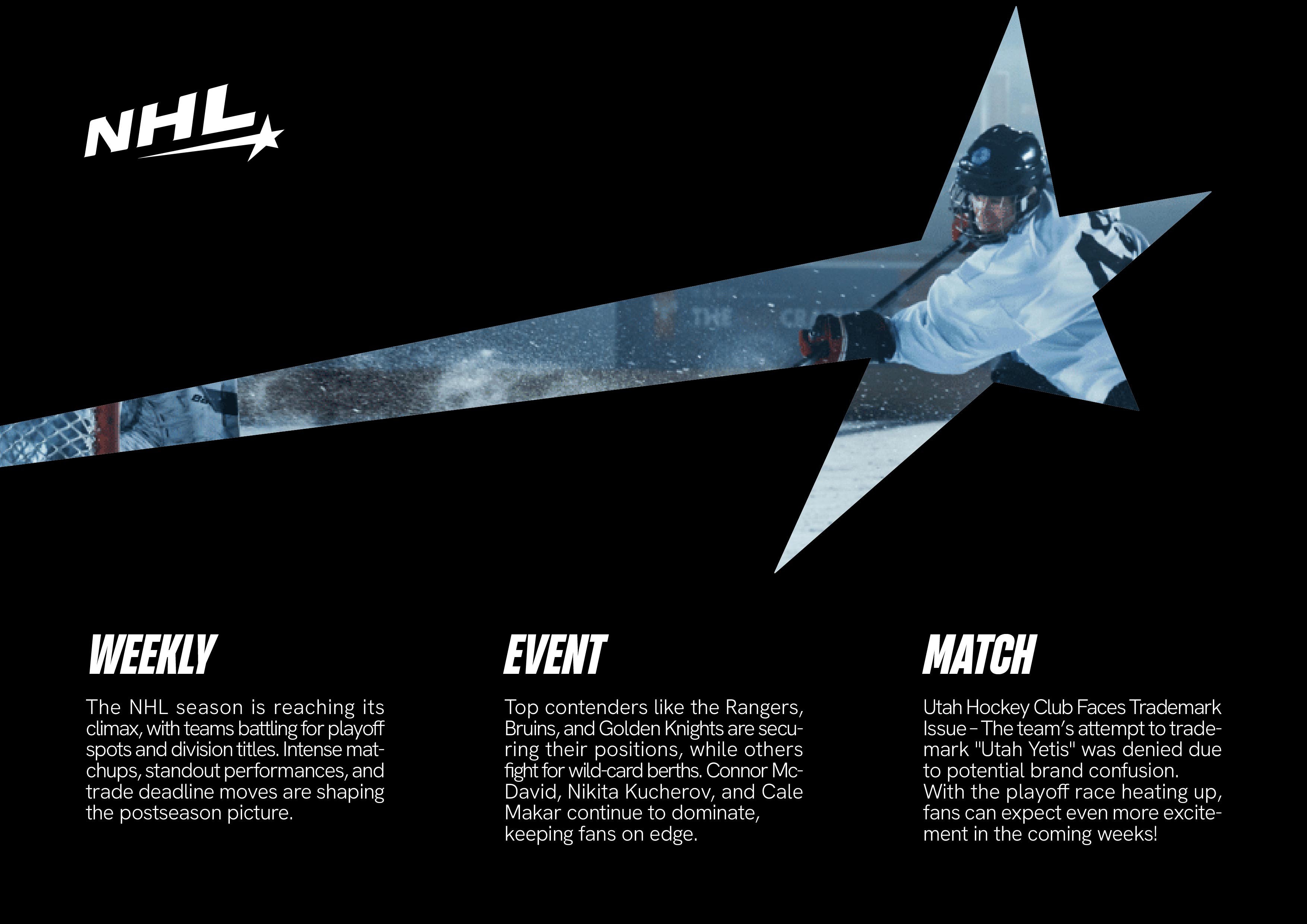 Founded in 1917 in Montreal, Canada, the NHL (National Hockey League) has thrived for years with the same mission: bringing nations together. The league has constantly evolved, showcasing generations of talent, all immortalized in the Hall of Fame. Here, we pay tribute to one of the sport’s most iconic figures, Maurice Richard, nicknamed "The Rocket"—a player of all records. Hockey is a sport of speed, power, and precision. This identity draws inspiration from the puck's trajectory, which varies based on shot intensity and the angle of the stick. Designed as a monochrome concept, it symbolically reflects power, the purity of ice, and impact.The league tells its story with a new tone of voice: "Bring back the heritage, focus on the legendary."